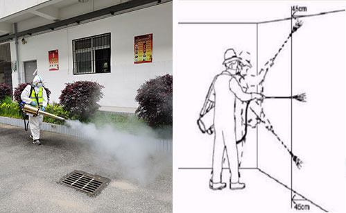 噴霧技術:掛流狀態; 1、橫向噴灑幅度為75 cm; 2、左右幅度間應有5 cm的重疊; 3、自上向下噴灑; 4、首先自上向下噴灑,結束一個噴灌噴 灑幅度 后,順時針橫移,開始下一個幅度噴灑; 5、保持噴嘴距離墻面45 cm; 6、開始噴灑時首先向前傾斜,當噴嘴向下噴灑時,身體向后傾斜; 7、自時口順時針操作,直至房間處理完畢; 8、對人體接觸較多的柜臺、桌椅、門把手、水龍頭等可用0.2%-0.5%過氧乙酸溶液或有效氯為500mg/L-1000mg/L的二氧化氯消毒劑進行噴灑或擦拭消毒,作用時間15-30分鐘。